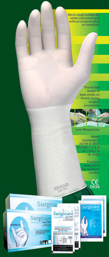 Surgicare Low Progloves is made from NaturalRubber Latex. The protein content is less than 100 dm2 to reduce risk of user being sensitized to Latex Protein Allergy Type 1.The glove is anatomically shaped with thumb ball effect,reducing hand fatigue during surgicalprocedures.The precision design fit and micro rough surface provides optimum comfort and better instrument grip without compromising on sensitivity.Surgicare Low Pro gloves provides excellent barrier protection for both doctor and patient.SAFETY FEATURES