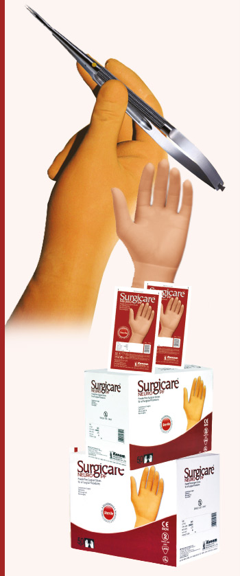 Surgicare•Neuro PF is made fromNaturalRubber Latex.The Skin coloured light browngloves proves to be a second skin for the doctor.The exceptionaltactile sensitivity,dexterity,and perfect fit is idealfor all Specialized Surgeriesspecial Safety Features